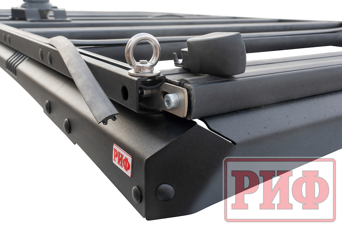 Алюминиевый багажник РИФ – это не просто платформа, на которую можно что-то положить, и притянуть подручными средствами к поперечинам, а полноценная система для крепления не только различных по форме и весу грузов, но и многочисленного дополнительного оборудования и инвентаря. В поперечинах, на всю их длину, есть пазы в которые заводятся крепежные болты кронштейнов или кольца для стяжных крепежных ремней. Таким образом точку крепления можно организовать в любом месте платформы. Толщина стенки паза, в который входит болт крепления, - 3 мм, что позволяет ему держать нагрузку на разрыв до 200 кг! Пазы закрыты специальными упругими пластиковыми защитными лентами, имеющими объемную полусферическую форму. Благодаря этому, груз, размещаемый на платформе, не контактирует с собственно алюминием, а лежит на этих лентах. Таким образом, не царапается порошковая краска багажника и сам груз. Также ленты препятствуют попаданию грязи, мусора и воды в пазы.